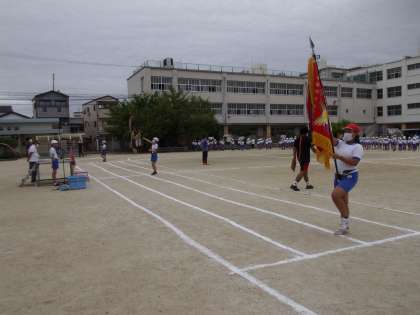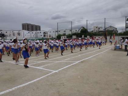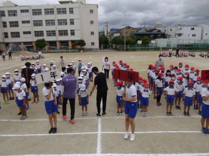 体育主任や学年の先生の話をしっかりと聞き、指示に従ってすぐに行動することができました。足踏み、行進も1回目としてはそろっていたと思います。