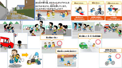 登下校中にけがなく安全に過ごすために、「狭い道は1列になる」「たくさん荷物を持っているときは走らない」「青信号でも左右を確認する」「不審な人に声をかけられたらどうする?」など、クイズも交えてお話をしました。
