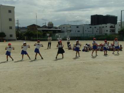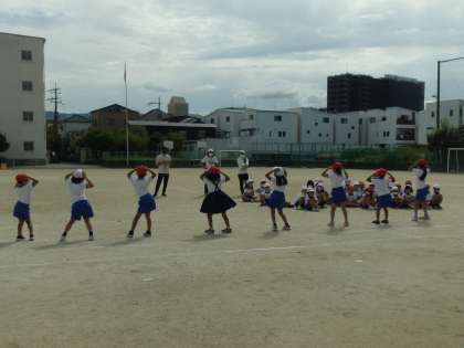 昨日、運動会「玉入れ」競技で披露してくれた「チェッ チェッ コリ・・・」のリズムに合わせたダンスの発表会が行われていました。
