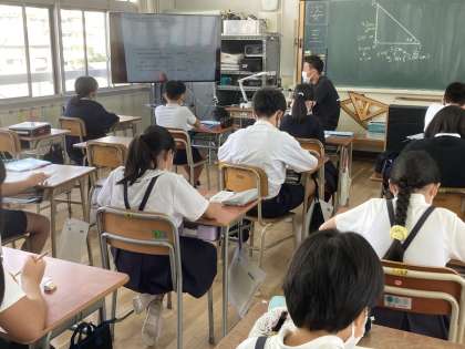 算数科で縮図の学習をしています。担任の先生の解き方を大型画面に映し、目と耳で確認しながら取り組みました。
