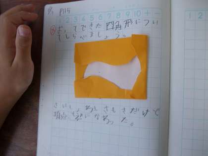 「直角」の定義をみんなで確認した後、教室の中の直角を探して発表したり、与えられた紙を折って直角を作ったりしました。