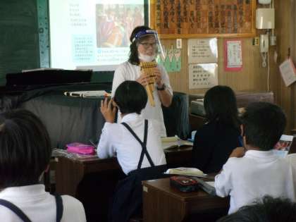 音楽の授業で、ジブリの天空の城ラピュタの曲「君をのせて」を歌ったり、外国の楽器「ケーナ」「サンポーニャ」の実物を紹介してもらったり、その楽器の音色を聞いたりしました。たくさんの音や楽器に触れ、楽しそうに活動していました。