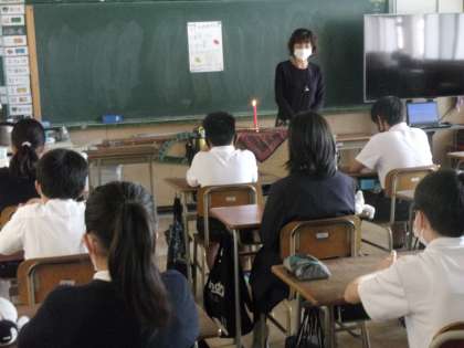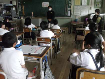 教室にろうそくに火が灯る、いつもと異なる雰囲気の中で、「でんでんむし」の方々の話の世界に子どもたちは皆(教職員も皆)引き込まれていきました。