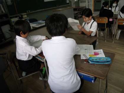 国語科で「モチモチの木」を学習しています。主人公の豆太の気持ちやその変化を読み取り、豆太がどんな男の子であるかを書き表しました。また、グループの話し合いで自分の考えを発表して、豆太について詳しく理解していきました。