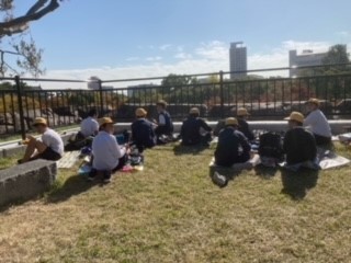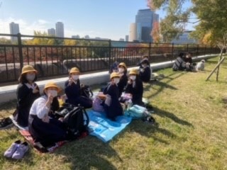 しっかりと学習した後は、大阪城公園でお弁当を食べました。きれいな秋空が広がり、太陽が照っていたので暖かく、ほのぼのとした雰囲気の昼食となりました。