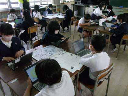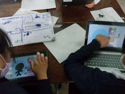 今日の授業では、4コマストーリーのそれぞれの場面を役割分担して、タブレットのプログラミングを活用しながら、話に合った画像を作りあげました。