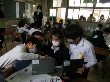 前回までの国語の授業で、グループで協力しながら想像を膨らませたオリジナルの4コマストーリーを作りました。