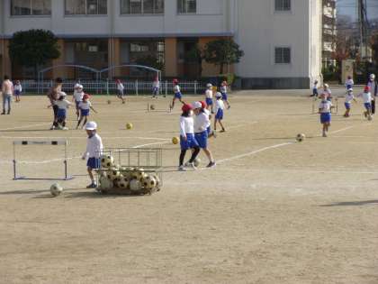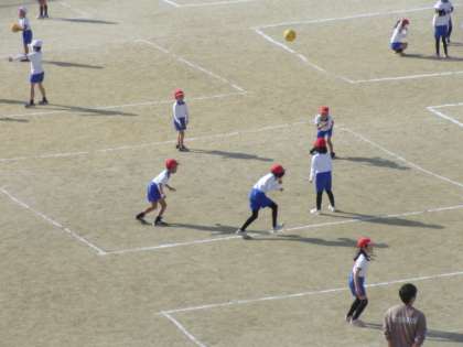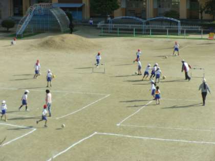 太陽の光を浴びて元気いっぱいの1年生は、運動場全体を広く使い、活動量を多くして取り組んでいました。ボール運動をもっともっと楽しんでほしいですね。