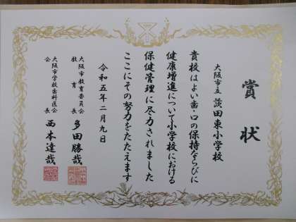 先日、茨田東小学校は、「大阪市よい歯の学校表彰」において、「むし歯や歯周疾患の管理に努力が認められる学校」として表彰を受けました。