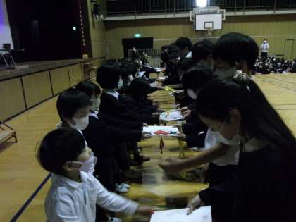 1年生が緊張した面持ちで6年生へプレゼントを渡した後は、各学年から卒業生をお祝いする映像が放映されました。