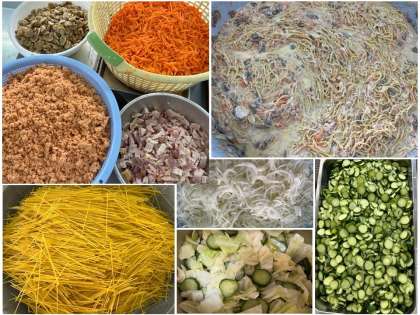 給食には、スパゲッティをはじめ、細く曲がったチューブ状のエルボ、らせん状にねじられたツイスト、リボン型のファルファーレ、アルファベットの形をしたアルファベット、車輪のような形のホイールなどが登場します。