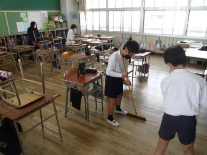 昼休みに運動場で元気に遊んだり教室で楽しく過ごした後、子どもたちは気持ちを切り替えて清掃活動に取り組んでいます。
