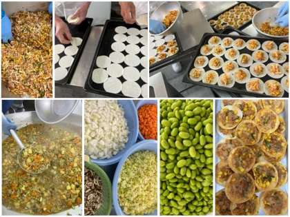 今日の給食では、ぎょうざの皮をピザの生地として使用した、変わりピザが登場しました。