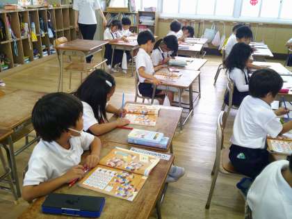 教科書や電子黒板の画面をよく見て、各グループの「赤」「青」がいくつなのかを調べました。