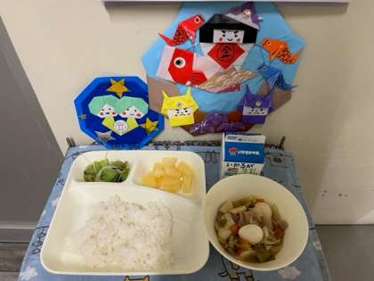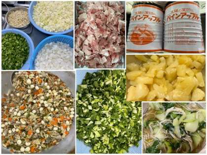 今日の給食では、豚肉、うずら卵、たまねぎ、キャベツ、にんじん、たけのこ、ピーマン、しいたけの8種類の材料を使用しています。