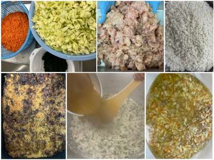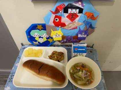 今日の給食では、米、鶏肉、たまねぎ、グリンピースを使用し、カレールウの素やクリームなどを加えたものに粉末チーズとパン粉をかけて焼き物機で焼いた、カレードリアが登場しました。