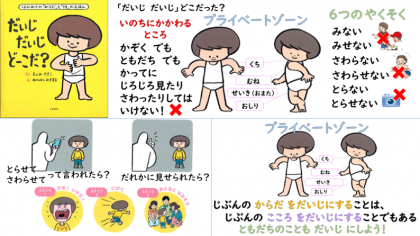 「だいじ だいじ どーこだ」という、易しい言葉で「プライベートゾーン」の説明をする絵本を使っています。「プライベートゾーン」とは、口と、水着で隠れるところ(胸、性器、おしり)のことです。体はどこも全部大事だけれど、この場所は「命にかかわる場所」だから特別大事なんだよ、と説明しています。プライベートゾーンを守るために6つの約束(見ない、見せない、触らない、触らせない、撮らない、撮らせない)をしました。また、体のことについて、「嫌だな」「変だな」「怖いな」と思ったことがあれば、すぐに大人に知らせるということも約束しています。