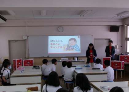 牛乳石鹸の方々にお越しいただき、「手洗い名人になろう」の出前授業をしていただきました。