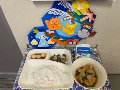 今日の給食では、月見の行事献立として、さといもを使った「一口がんもとさといものみそ煮」、だんごを使った「みたらしだんご」が登場しました。