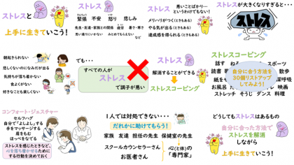 ストレスを感じ続けると、眠れない、突然涙が出る、好きなことも楽しく感じない、食欲がなくなるなど、心にも体にも悪影響が出ることを伝えました。元気な間に、自分に合ったストレス解消方法を30個程度書き出すことを勧めています。また、自分で心を落ち着かせるための「コンフォートジェスチャー」を教えました。セルフハグ、自分で頭をなでる、自分で手などをマッサージするなどの行動をすると、リラックスしたときに働く副交感神経が刺激され、緊張や不安が落ち着くといわれています。
