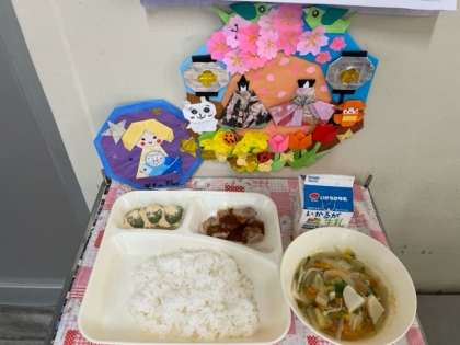今日の給食では、砂糖、うすくちしょうゆ、湯を合わせて煮、でん粉でとろみをつけた甘いみつをからめ、喫食時にきな粉をかけて食べます。
