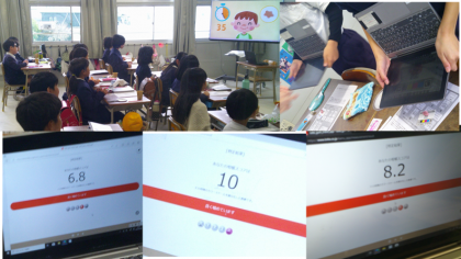 そのあと、「咀しゃくチェックガム(唾液と反応して、よくかめているほど色が変わる)」を使って、しっかりかめているかどうか確認しました。タブレットで撮影すると、「咀しゃくスコア」が表示されます。0〜10点で評価され、多くの児童は8前後でしたが、満点の10点が出ている児童もちらほらといて、日ごろからよく噛めている児童が多かったと、歯科衛生士さんがほめていらっしゃいました。