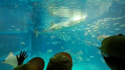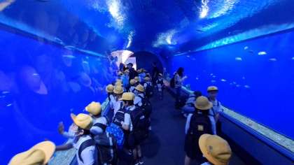 館内見学が始まりました。たくさんの生き物がいて、みんな楽しそうに見ています。