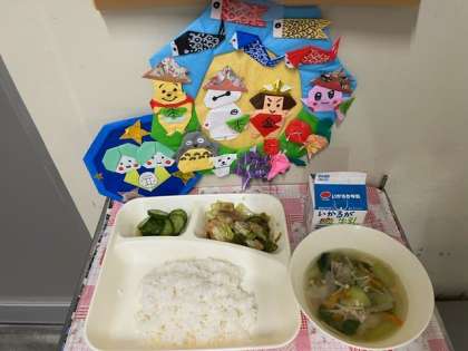 給食では豚ばら肉をゆでてから、ピーマン、キャベツ、白ねぎ等といためています。