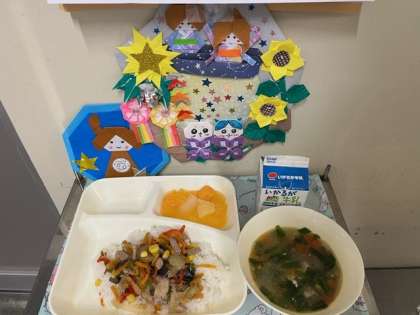 献立のねらいは、「夏祭りのだんじりを盛り上げるために、給食で夏野菜をたくさん食べて体力をつけることができるように工夫しました。お祭り気分を味わえるように彩りも考えました。」とのことです。