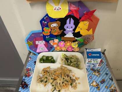 給食では、他人丼は、卵の除去食対応献立です。だしこんぶとけずりぶしでとっただしで牛肉、たまねぎ、にんじんを煮て、砂糖、みりん、塩、しょうゆで味付けをし、青ねぎを加えて煮て、「卵除去食」の分を取り分けています。