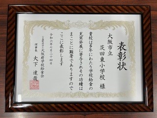 茨田東小学校が学校給食の充実発展に寄与したとのことで、大阪府学校給食会より表彰されました。