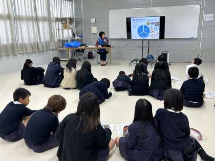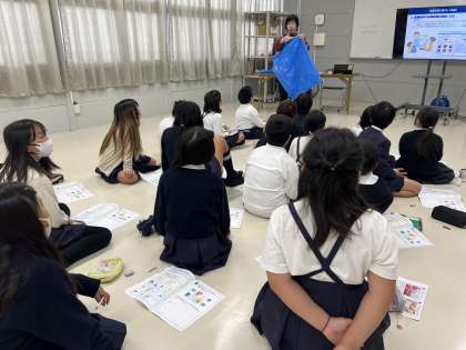 今日は大阪ガスの方が出前授業に来てくださり、子どもたちに地震などの災害が起きた場合、電気や水道などのライフラインは災害時どうなってしまうのか?緊急バックの中身はどんなものがあればいいのか?などのお話をしてくださいました。また、チラシなどの外用品で緊急時にも使えるスリッパを作ったり、寒さをしのぐためごみ袋を活用したりすることなどを教えていただきました。