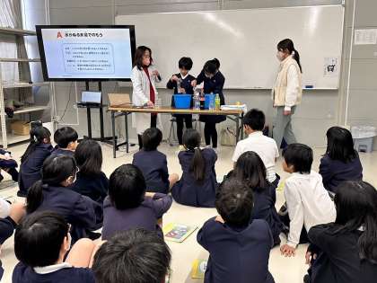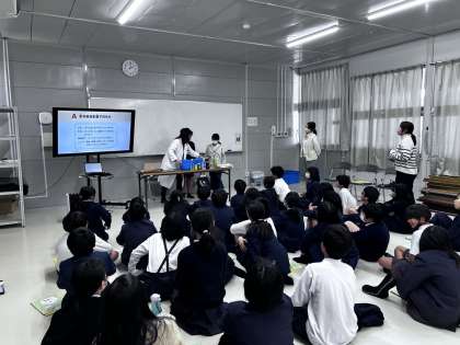 最初に「くすり」の働き、種類についてや、くすりの正しい飲み方について教わりました。くすりを飲むときには、どんな飲み物で飲むといいのか?実際にジュースやお茶、水の中でくすりがどう溶けていくのかが分かる実験をしました。