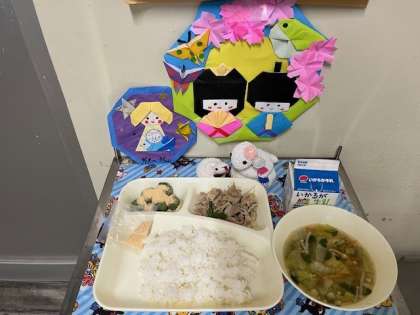今日の給食では、よもぎだんごを蒸し、とろみをつけたみつをからめ、喫食時にきな粉をかけて食べました。