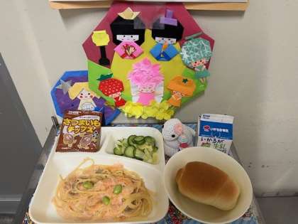 給食では、食物アレルギー対応食品として、小麦を使わない米粉のマカロニを使っています。