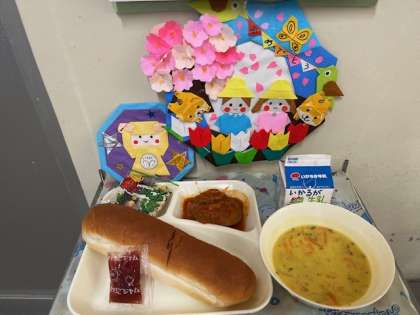 今日から、今年度の給食が始まりました。子どもたちは楽しく、笑顔いっぱいで給食を食べていました。これからも好ききらせずにしっかりと食べて、元気に過ごしてもらいたいと思います。
