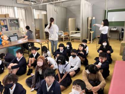 養護教諭の先生から視力検査を受けるための手順や方法について説明されました。子どもたちは、先生の話をしっかりと聞き、検査を受けるまで静かに待つことができていました。