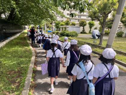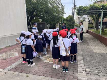 校区めぐりに行く前に、学年の先生たちから「走らないこと。茨田東小学校の近くに住んでいる人たちの迷惑にならないこと。安全に校区めぐりをすること。」などのお話をされました。1年生は中央公園に向かう途中で、いろいろな花や昆虫、木や建物があることに気づきました。また子どもたち同士、離れすぎないことに注意して交通ルールを守って無事に学校に帰ってくることができました。