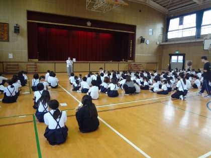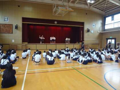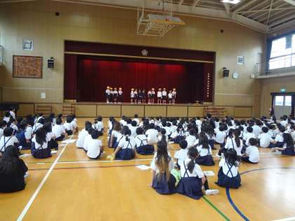 朝の集会で、今週末に開催する「すきやねん茨田東」で各クラスの出し物についてCMを行いました。