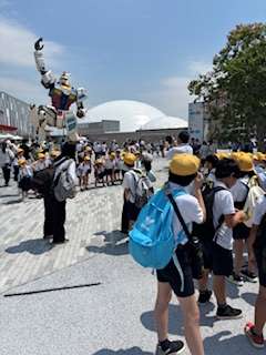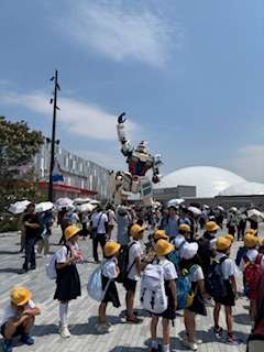 全員入場しました。トイレを済ませガンダムを背に記念撮影をしたところです。これから大屋根リングに登りたいと思います。