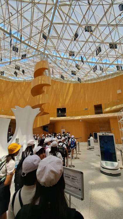 食後は大阪ヘルスケアパビリオンの見学です。iPSの技術をいかした動く心筋シート等、子どもたちは真剣に見ていました。