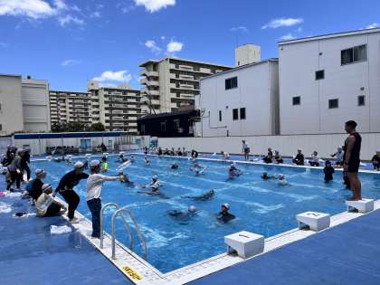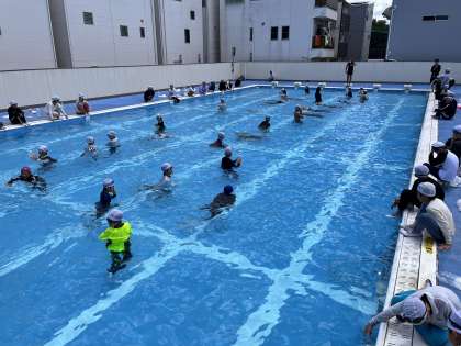 安全救助の方法についても学ぶことができましたが、夏休みには家族で川や海などの水のある所に遊びに行く機会も増えると思います。今後も水辺での思わぬ事故への対処方法を学ぶ場として、着衣泳の学習を続けていきたいと思います。