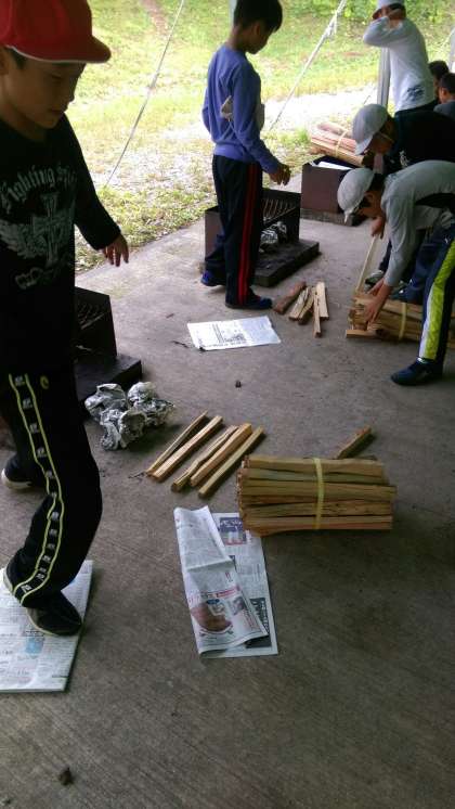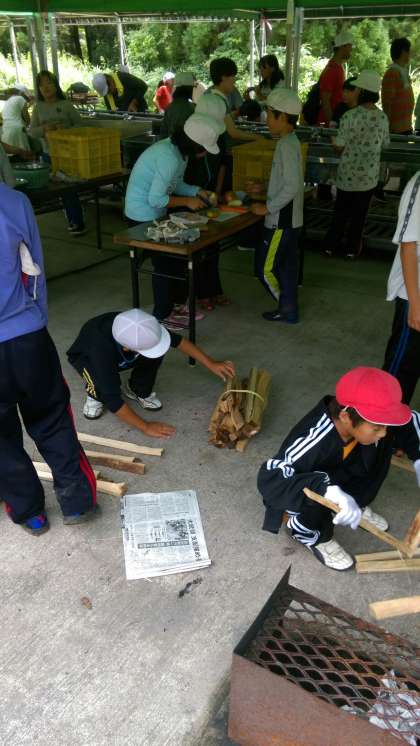 かまどに火をつけようとする男子。