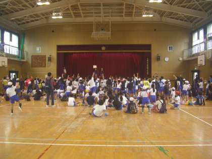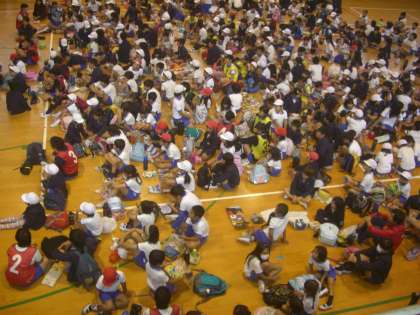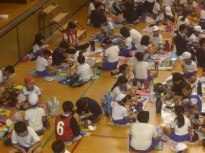 鶴見緑地でお弁当を食べる予定が、雨の影響で学校の体育館で