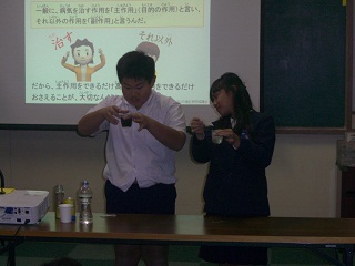 飲むと薬が変化してしまう事を、簡単な実験を通して学びました。