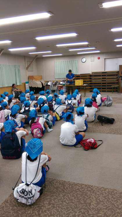 雨のため 多目的室で 野外調理の説明がされています。
