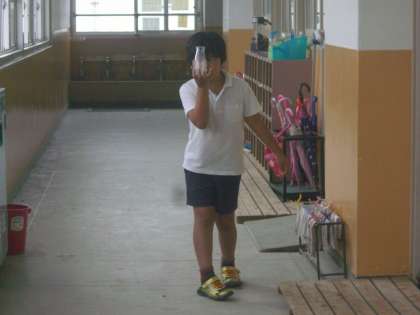 牛乳瓶を目に当てて、景色を見ているらしい。