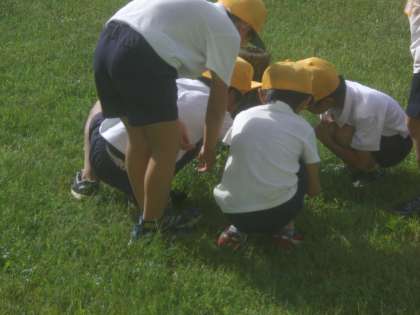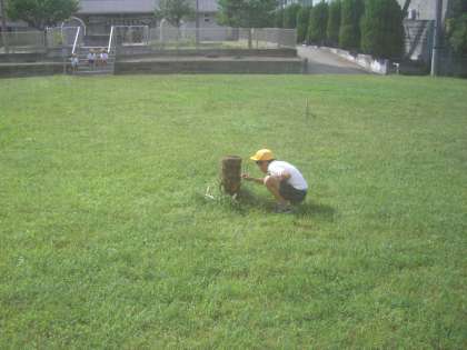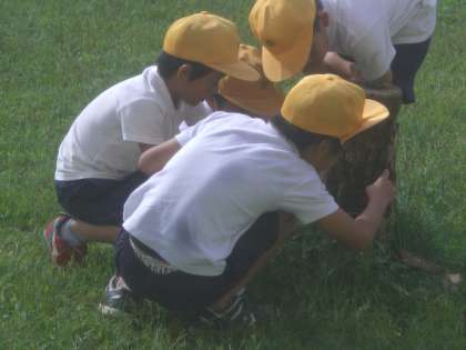 2年生が、腐りかけた切り株の樹皮をむいています。
