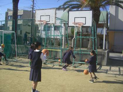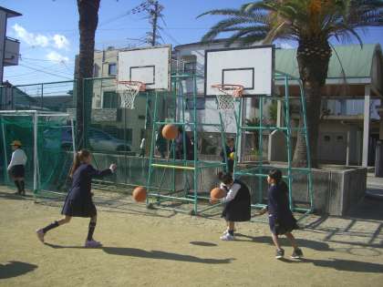 やぶれていたバスケットゴールのネットを新しく付け替えました。さっそく、ゴール練習する4年生。なかなかの腕前です。