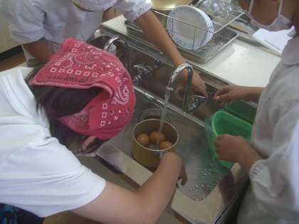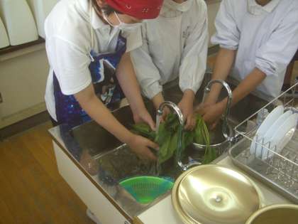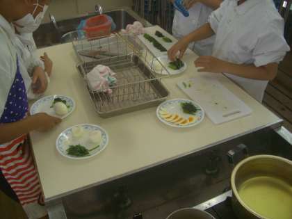 5年生の家庭科は調理実習でした。ホウレンソウを湯がくことと、ゆで卵をつくることが、今日の調理内容でした。